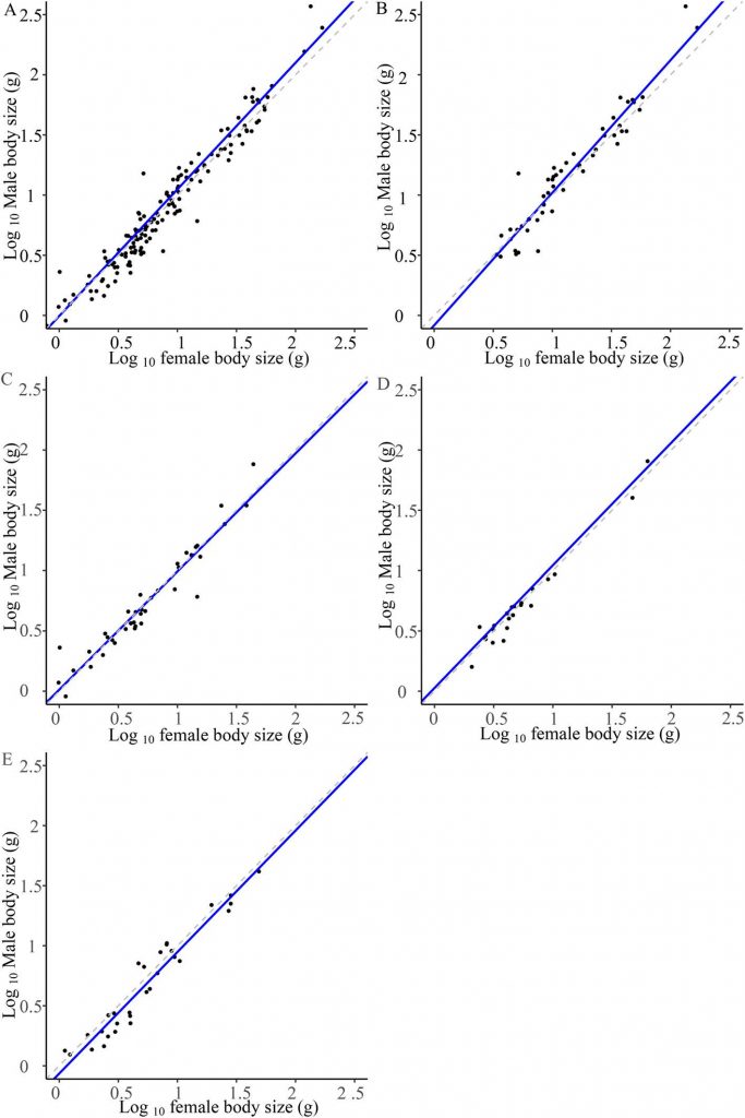雌雄两性在体型大小上存在差异的现象称之为 体型的两性异性(SSD)。这种现象在动物界中非常普遍,比如:哺乳动物,爬行动物、两栖动物、鱼类和昆虫等。这种现象主要存在三种模式:1.雄性体型大于雌性;2.雌性体型大于雄性;3.雌性和雄性体型大小相等(近)。Rensch法则描述了体型两性异性异速增长的模式,它指出两性体型之间的差异,随着雄性体型的增大而增大,随着雌性体型的增大而减小。
