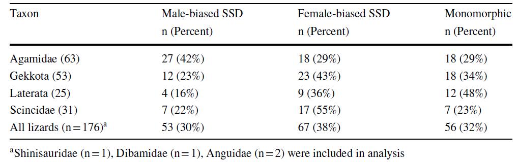 1 在整体上,中国蜥蜴表现为雌雄两性体型相近,约30%的蜥蜴表现出雄性体型大于雌性体型,而38%的蜥蜴表现出雌性体型大于雄性体型。而在四个主要类群内:鬣蜥科、壁虎科和蜥蜴科表现为雌性体型偏大于雄性体型;石龙子科表现为雌雄两性体型相近。